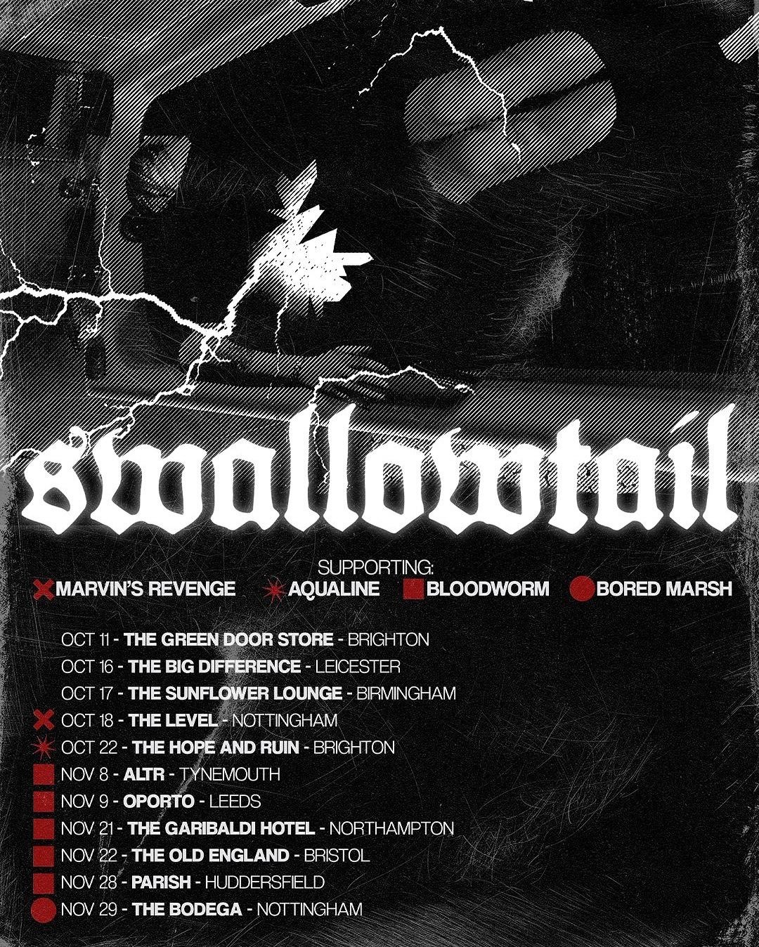 Brighton based quartet Swallowtail have today announced a host of UK concerts for this coming Autumn, and thankfully two of these will be happening here in Brighton. The first of these will be a headline set at the Green Door Store on Saturday 11th October with tickets on sale very soon. The second will be at The Hope & Ruin on Wednesday 22nd October as support to Guildford based quintet Aqualine, who comprise Ben on vocals, Patrick on lead guitar, Will on rhythm guitar, Gray on bass, and Sam on drums. Together, they craft an explosive yet melancholic blend of alternative rock, drawing inspiration from a diverse range of genres such as shoegaze, grunge, hip-hop, and experimental ambiance. Known for translating their recorded sound into electrifying live performances, Aqualine infuses the raw and vibrant elements of their stage presence into their layered studio productions, captivating audiences wherever they take the stage. Tickets for this concert can be purchased HERE.