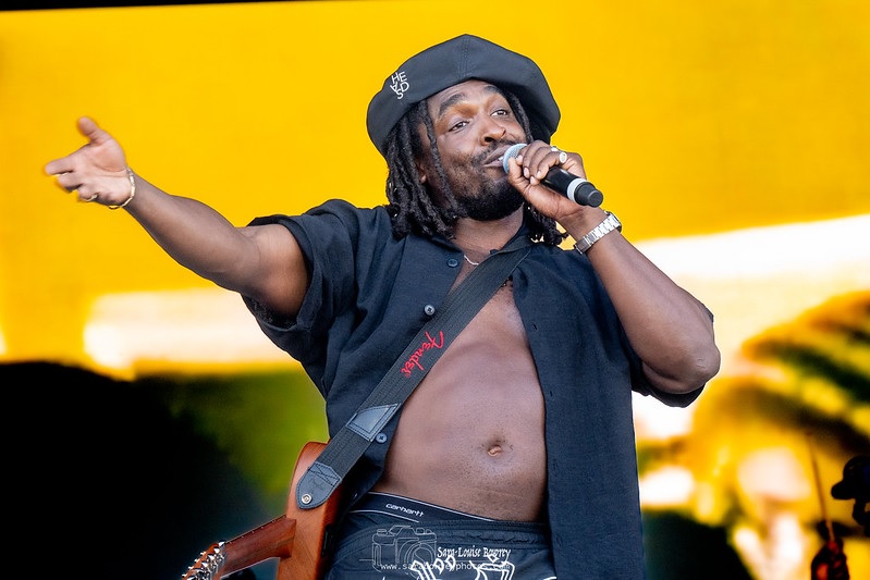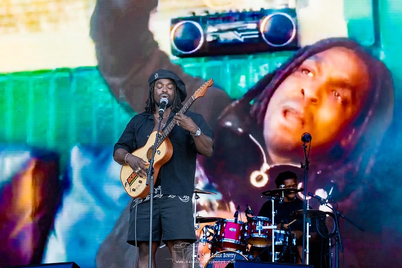 Hak Baker is next and is someone I’ve not heard anything about, so I was looking forward to seeing him perform with his band. A complete change to the two punk styles of music that started the day. Hak is a proud 34-year-old East Londoner with West Indian roots. He learned to play guitar with by-weekly two-hour lessons whilst serving a prison sentence. Previously, he was part of the London grime collective Bomb Squad. As a solo artist, Hak’s songs mix elements of folk, grime, acoustic guitar, reggae, ska, and punk with his soulful voice and has coined his type of music as G-folk. His first releases came out in 2017, and he has gone on to record a number of songs, including albums ‘Babylon’ released in 2019 and follow-up ‘World’s End FM’ in 2023.