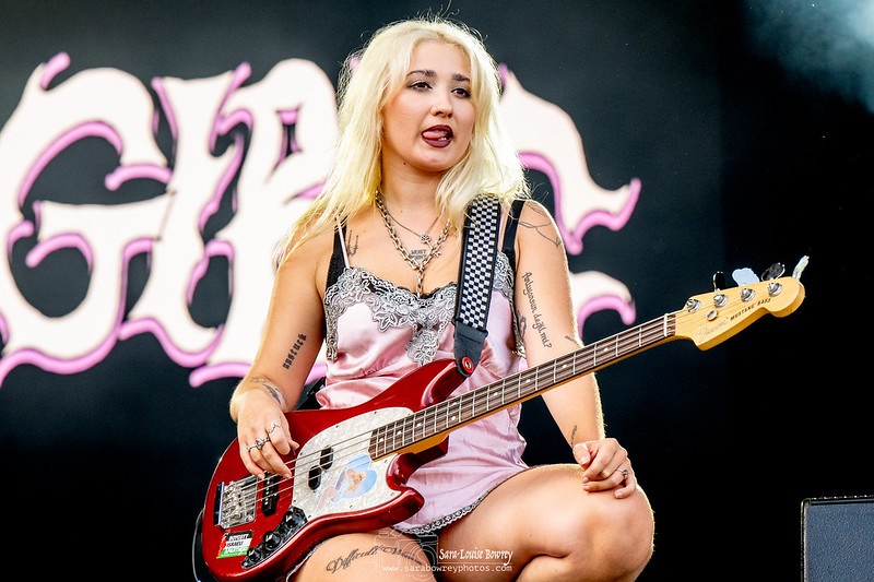 Lambrini Girls are next on stage, and although I go out and see many gigs in their native Brighton, they are a band I’ve not seen perform live before, usually due to clashes with other bands playing at the local venues. Popularity-wise, they’ve been on an upward trajectory since their debut single ‘Homewrecker’ came out in 2021. Their debut album ‘Who Let The Dogs Out’ was released in January this year and did very well, making it to No. 16 in the Official UK Albums Chart. In their short career, they’ve had a few line-up changes since their first show as a quartet in May 2019 and now seem to have settled as a three-piece with Phoebe Lunny on lead vocals and guitars, Lilly Macieira-Boşgelmez on bass and backing vocals, and Misha Phillips on drums.