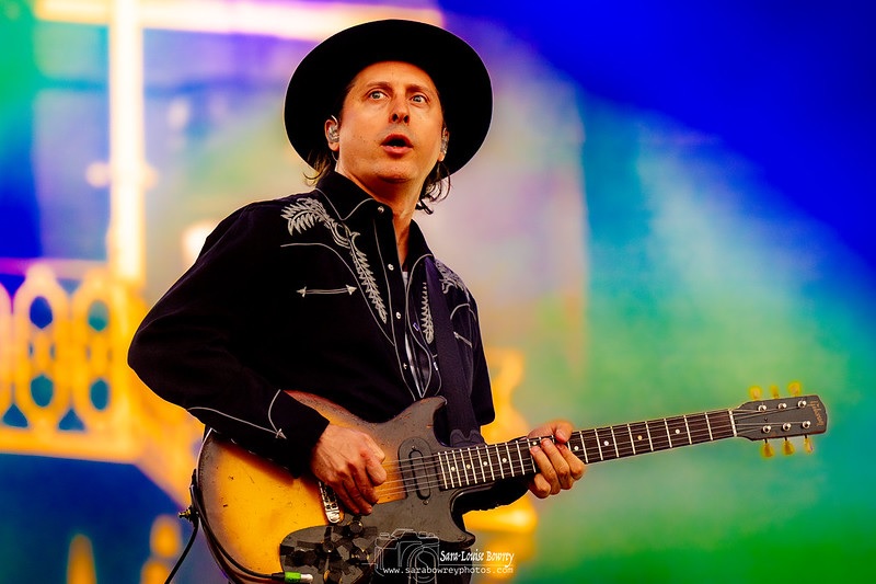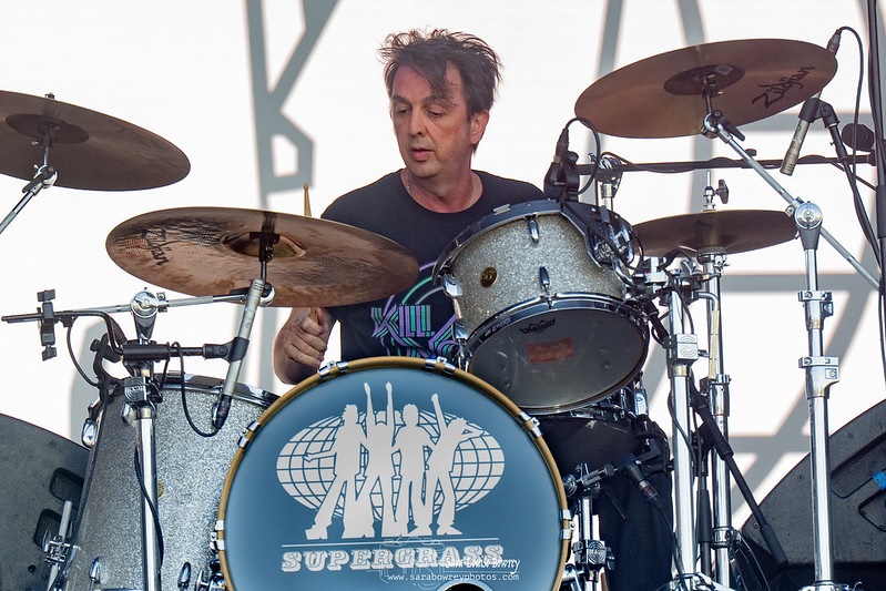 Next, we get ‘Strange Ones’, then it’s time for the band’s first Top 10 single from ’95 ‘Lenny’ that features Benny on bongos, but he is hidden away behind the guitar amps, so we never get to see him. Gaz remarks, “Sometimes it works, sometimes it doesn’t,” and then says, “We are going to jump forward a few years”. Gaz switches to acoustic guitar, and we hear 2005’s ‘St. Petersburg’. It’s the first time that Gaz’s brother Rob’s keyboard playing stands out, as it does for the following song and another crowd favourite ‘Richard III’. During ‘Moving’, I spot a few people crowd surfing towards the front. Another thing that was more prominent at Supergrass gigs in the early days: Gaz asks “You want some more?” Of course we do! We get ‘Grace’. Gaz then says “We would like to thank our old friends The Libertines for having us today. This is for The Libertines, you’ll know it”. It’s one of my favourite Supergrass songs, ‘Sun Hits The Sky’, and it sounds great. To finish off a splendid set, we hear ‘Pumping On The Stereo’. Prior to them playing this, Gaz asks the crowd to “sing a long if you know it”,and plenty do by the sound of it.