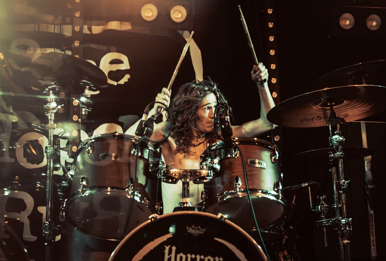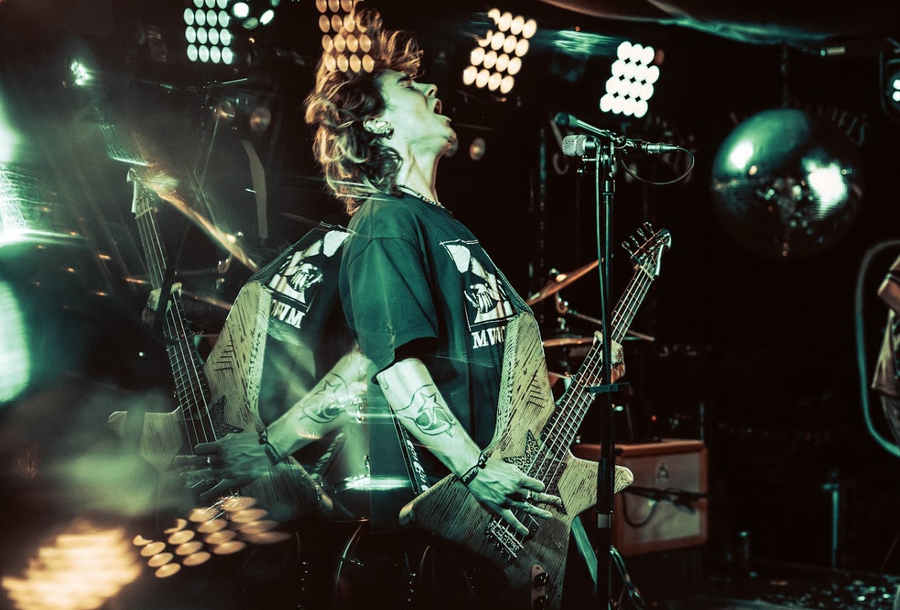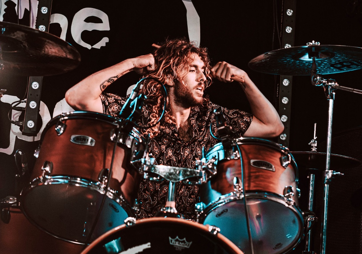 The lads are very tight this evening as they lead into the EP title track which has a 70’s TV theme vibe at the beginning. Arthur’s vocals and screams are truly guttural and the punters cannot fail to notice them. But just in case they do, then Herbie briefly vacates his drumkit and jumps off the stage with a blue cowbell in hand and wanders in amongst the crowd whilst playing it, whilst his chums deliver the musical feedback. ‘Don’t Leave Me Now’ came next and there was a photo opportunity mid-tune as Arthur stood on top of one of the speakers and then launched himself and bass off of it.