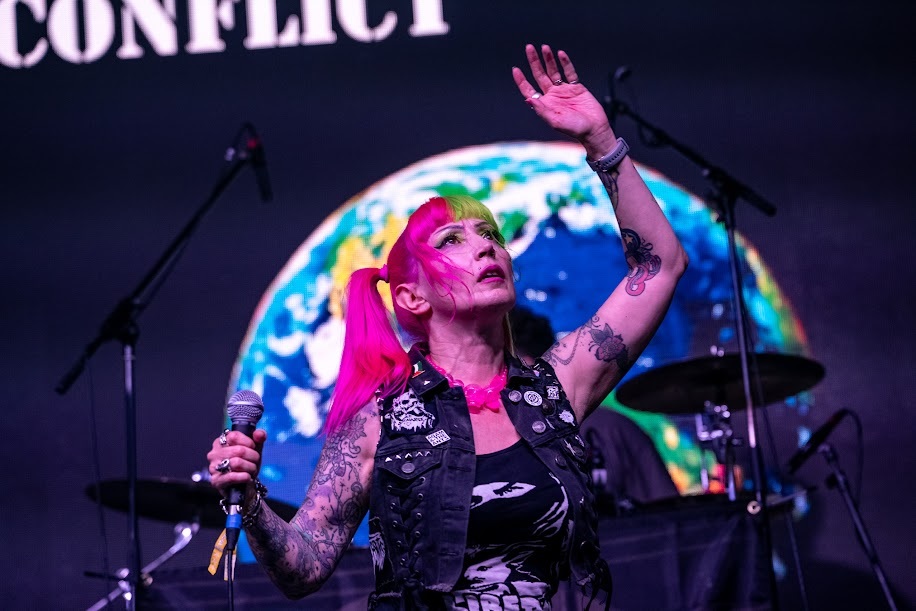 A few hours earlier I had been at the Literary Stage for the Colin Jerwood memorial talk. He sadly died recently, but it was nice to see some tributes and anecdotes from his family and friends. I thought it was only fitting to watch his band, Conflict perform on the Club Casbah stage shortly afterwards. They had recently released a new album, so it was good to see the songs performed by the rest of the band (with the family’s blessing of course). Fi’s a top frontperson, so she had no problem replicating the dual vocal attack she shared with Colin in recent times. There were Jerwood memorial banners either side of the stage, and family and friends were watching from the wings. ‘Cruise’ kicked things off appropriately, with moving images of social unrest on the backdrop. They played some new songs off the album and then unleashed the animal rights classic that is ‘Tough Shit Mickey’. ‘Mighty And Superior’ was played, and our fists were well and truly in the air as they ended the night with the poignant ‘Serenade Is Dead’. We are probably not going to see this version of the band for too much longer, so it was an emotional part of the weekend. Colin Jerwood’s lyrics have influenced so many of us, and I’m sure they’ll be taken on for generations to come. A fitting tribute to such an influential band and singer.