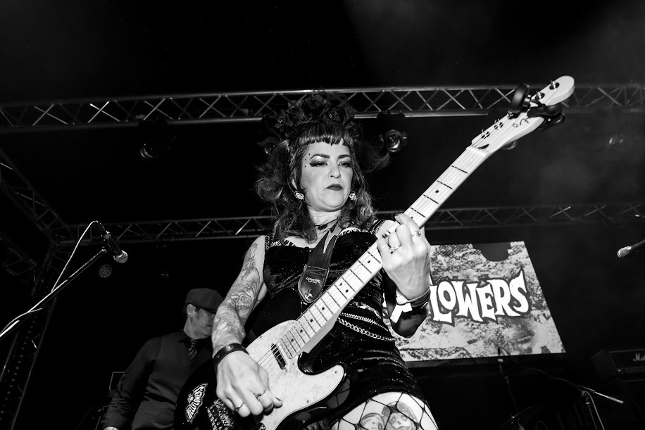 The Hellflowers hail from Los Angeles, California, and were formed by married couple Christina Eskew on vocals and rhythm guitar, and Matt Eskew on bass. They describe themselves as punk, but their opening track is a surf influenced instrumental. There’s a definite Cramps influence too. They apparently have a new guitarist. I didn’t catch his name, but he has a Gretsch White Falcon, and that’s good enough for me! Not only does he have a brilliant guitar, he has the playing ability to match! Drummer Stevyn Grey is a cataclysmically powerful drummer, so all in all, they make an impressive team. They very quickly have the audience in the palm of their collective hands, bellowing along with the band. They play a couple of new songs, one of which may be called ‘Stop Harming Me’. Christina discards her guitar and is in the pit getting up close and personal with the crowd. They had an album out at the beginning of the year called ‘Deluxe’, and from that they play ‘F*cked Up Nation’, which may or may not be about the USA. All in all this is a firecracker of a band with some awesome tunes. They really ought to come back to the UK soon!