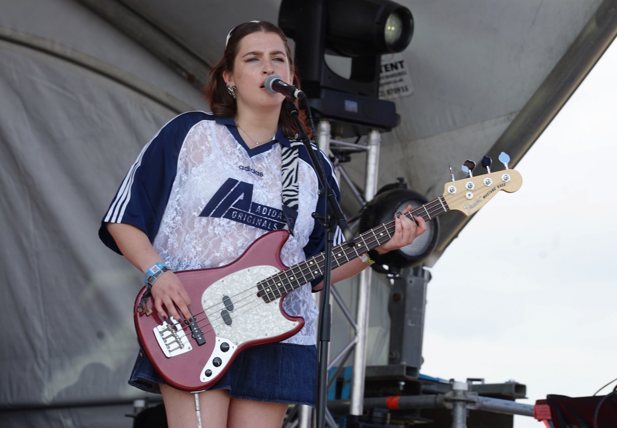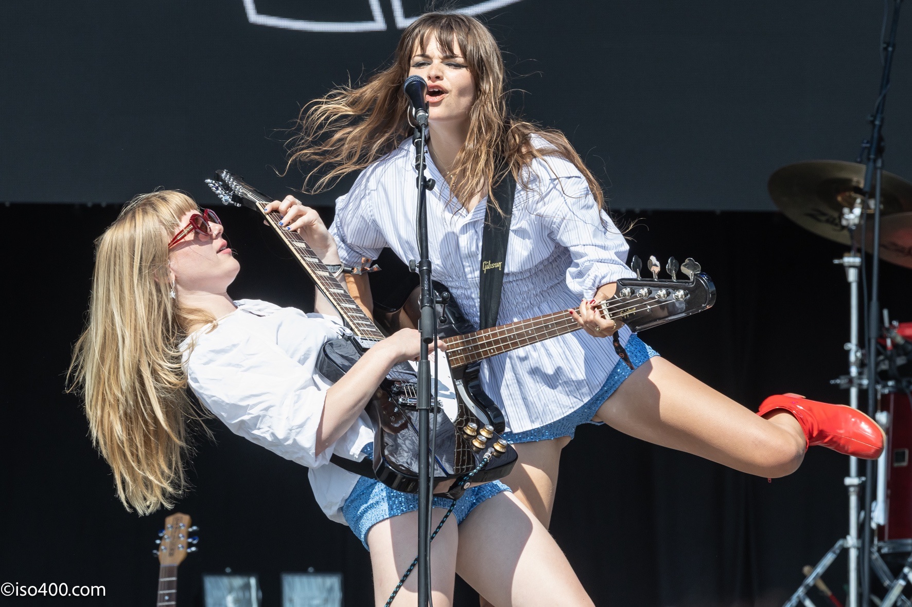 The opening band to play the Common Stage on day two of the festival were Isle of Wight punk / garage rock outfit The Pill. They play short, fast-paced songs with satirical lyrics about everyday situations. They are great fun to watch, as I first witnessed when seeing them play at The Albert in Brighton supporting Hinds last year. Lily Hutchings (guitar) and Lottie Massey (bass) share vocals, with Rufus Reader playing drums. They walk onto the stage to cheers with the front duo Lily and Lottie wearing matching white tops and short sky blue sparkly shorts. Lily welcomes the onlookers with “How you doing, Victorious?”. They then go straight into the opening song ‘Scaffolding Man’. Lottie then says “Hello everyone, we’re The Pill” and they play ‘Salt Father’, a song about sugar daddies. Lily then asks “Who here is from the Isle of Wight?” A few in the crowd respond, and then Lily tells us she nearly missed the ferry. Following ‘Problem’ and a song about being sad, Lottie asks those wearing hats to take them off and do a spin. Those in the crowd oblige, and Lily says “It looks like we are in the clear”. They were looking for mullet haircuts as the next song was ‘Money Mullet’. Banter between the two vocalists and the crowd continues, then we hear ‘Woman Driver’ and their first single ‘Bale Of Hay’, before the quick-fire 24-minute set is finished off with ‘POSH’. The front pair then raise their guitars above their heads, do a spin, and switch off their guitar pedals in unison before heading off stage to great applause. Less than six hours later, The Pill were back on stage at the Reading Festival, where they played the BBC Introducing Stage. They play two shows at Concorde 2 in Brighton on Wednesday, 3rd September, supporting The Hives.