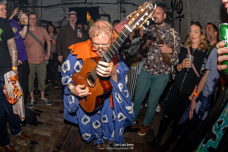 As they take to the Green Door Store stage, most are wearing orange smocks with dark blue hoods and pumpkins spring to mind. Once they start playing, my mind conjures up images of Blind Yeo performing outside of Megalithic burial tombs hidden somewhere in deepest darkest Cornwall. The drums kicked them off, followed by a constant keys droning sound and I immediately get that late 1960’s early 1970’s trippy vibe. It seems as though they are outdoing Gong with their blend of psychedelic rock, folk, electronic and country. Their second track is a good instance of this with its off-kilter drum beat and echoey guitar, and even feels like Moon Duo. Will with his amplified acoustic guitar often shares vocal duties with his young counterpart on keys and this works rather well. Will is a very animated figure during the whole set and even comes off stage to surprise the punters with his antics. It seems that they haven’t played that many gigs outside Cornwall, but you know that Lewes has a totally different music vibe and punters to that of Brighton, well I reckon that Blind Yeo would be welcomed with open arms at the Lewes Psych Fest as they totally fit the bill. In all honesty, they were about a million times better than I initially thought they were going to be, and so I would give them another go without hesitation.
