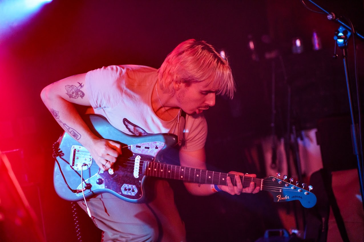 I made my way down to Volks nice and early. I’ve been to the venue for club nights in the past, but have never seen a band with instruments play live there and was quite frankly wondering how there would be space. Thank goodness I did get in early, the place filled out rapidly to capacity and it was insanely hot and dark. 7pm came, but no band appeared, it transpired they were stuck in traffic having driven from last night’s gig in Newcastle. At 7:20pm salvation was here, the band arrived pushing their way through the crowd with their instruments, there was no time for big set up’s or sound checking, this was going to be plug in and play with the sound tech informing them. They can start but go no later than 8pm, so at 7:25pm Crocodiles brought the noise and then some for a sadly all too short 27 minute set. So who are Crocodiles, they are formed by core members, Brandon Welchez (Guitar & Vocals) & Charles Rowell (Guitar and Backing Vocals) in 2008 and are from San Diego, USA, the rest of the band are Atef (Bass Guitar) and Diego Dalbon (Drums). They have 8 albums under their belt and plenty of singles, they last played Brighton at The Hope & Ruin back in 2013 and again in 2019, so it’s been a while. Let’s hope the wait has been worth it.