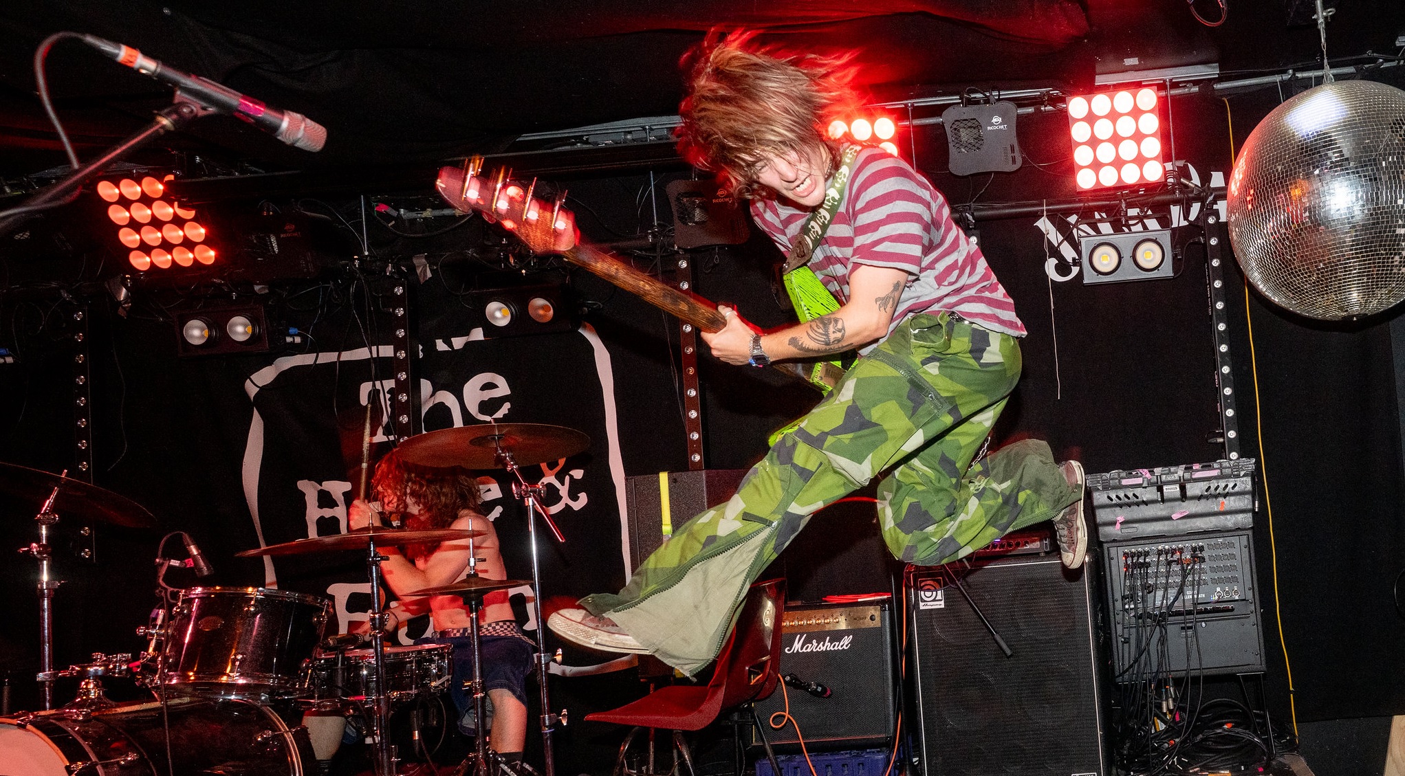 They start their set with an unreleased grunge track, ‘Soda’. This features shared vocals from Arthur and Sonny. During the catchy second song, ‘Just Bananas’, Arthur leaps from a chair that has been placed next to the drum kit. Their debut single, ‘Asbestos’, is next, then Arthur asks, “How’s it going? We are Bones Ate Arfa. We are going to play you a new song, and we’re going to dedicate it to Wing! It’s called ‘Not All Wings Are For Flying’.” This goes down well with the audience, which includes some Hidden Herd regulars.