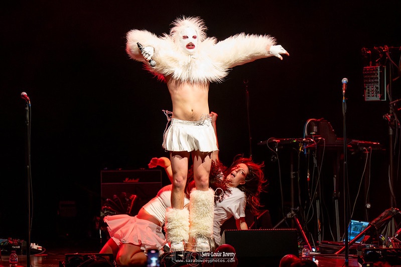 Infusing an extravagant stage presence with heavy electronic dance and evaluations on British gay culture, Lynks won over the crowd in seconds flat with the immediate club sonics of ‘Lynks Thinks’, donning a fur crop top and mask aside his two angels. During this track and the following number, a cover of Courtney Barnett’s ‘Pedestrian At Best’, there were occasional mic feedback issues, which, despite clashing with the energy of the first leg of the set, were quickly resolved. Lynks takes a moment to address the choice of support, stating “I get this reaction a lot, for a John Grant support, you’d expect this Icelandic beauty, wouldn’t you? Instead, you get a gimp yeti”. The piano bassline and four on the floor beat of ‘Use It Or Lose It’ underlies the topic of feeling like your mid-20s will be the peak of your attractiveness, while during ‘Tennis Song’, Lynks and their dancers lob a few tennis balls into the crowd atop a muzak beat that reminds me of OMD’s ‘Enola Gay’.