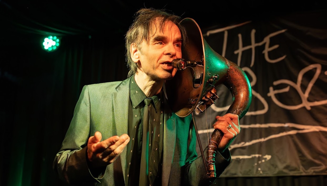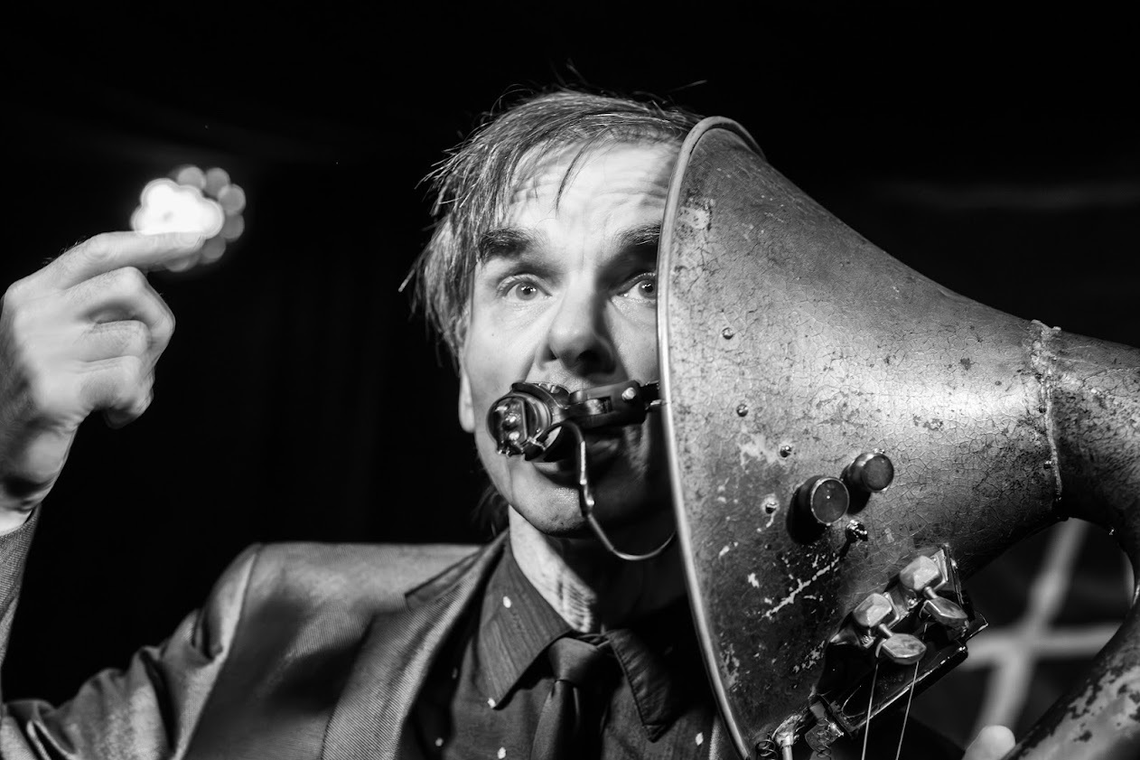 After huge cheers, he then held up the bronze horn of the Hornicator to his ear, with a mic inside and started performing the glorious ‘The Precarious Walz’, tapping, looping and pulling strings, into a surreal underwater avant garde stomp. As he waltzed with the Hornicator. We were in Truax’s wonky world – in his parallel ‘Wow Town’ and it was glorious. “Join in if you so feel inclined” he said with charm. It was so dark, stylish and utterly convincing. We need a Tim Burton – Thomas Truax collaboration asap! He sang with a dystopian swing “Time is a merry go round happiness a moving target” ending with “That Dance of Death and that dance of life they walk so precariously”. Looping his voice to echo multitudes, you could imagine an animated row of omniscient skeletons waltzing across the stage singing universal truths. Of course, in his day job moons ago, he was an animator for MTV’s ‘Celebrity Death Match’ and Cartoon Network’s ‘Robot Chicken’ so the visual side of his performance is as meticulously crafted and spellbinding as the musical side.
