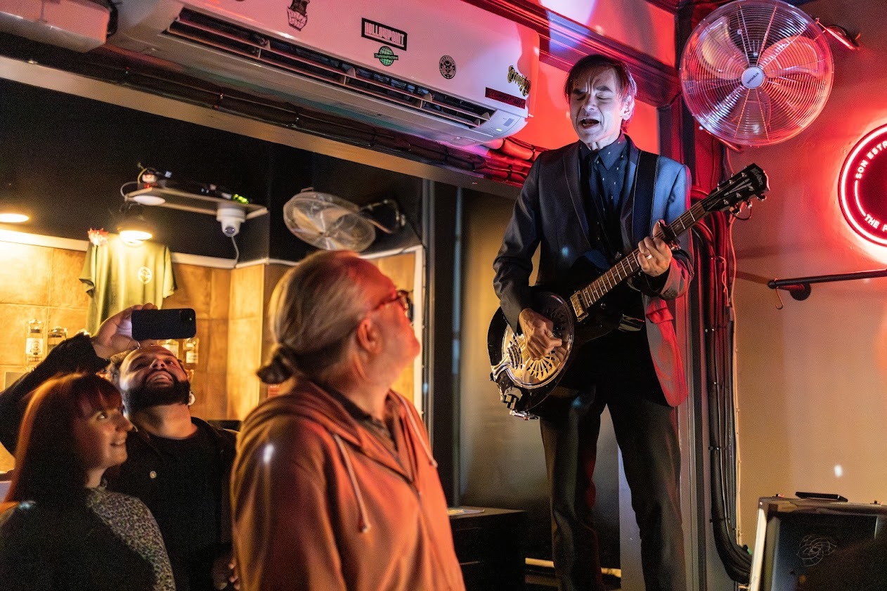 He then burst into a fan favourite leaping off the stage and into the crowd saying “This is a song about where I grew up..If you look up amongst the stars what can you make out?”.  He projected a moon onto the ceiling from the neck of his guitar, Hank and many went “Ahh” in anticipation. He said. “In Wow Town where I grew up, whenever we see this- everybody, all the aunts, uncles, groundhogs, centipedes we run down to the churchyard and do this little song!” and then 80% of the crowd joined him in singing “Well there’s a full moon over Wow Town tonight” as he wove through the crowd immersing us in his world then disappearing out the door and appearing standing on top of the merch table at the back of the room. He leapt off the table and he wove back through the crowd taking us on a lyrical tour of Wow Town before leaping back on stage to be reaccompanied by Mother Superior on drumming duties before hovering over the crowd and performing an ultra version of the song with a surreal, glitchy VHS energy, before speeding up and leaping back into the crowd It was utterly hypnotising as he spun around the room singing with Hank the guitar and soundtracking the ‘crickets a chirping.’