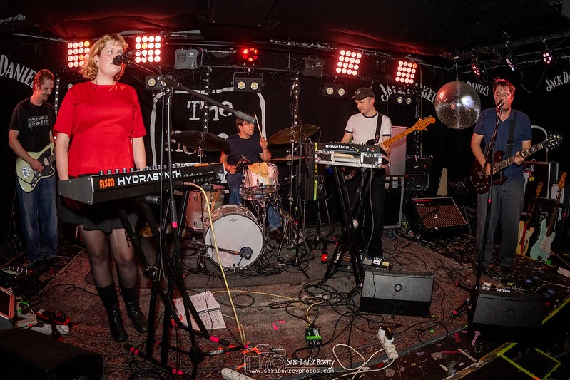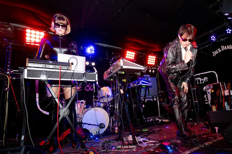 Kicking off this evening’s sonic adventure is Solid Pleasure. I had struggled to find anything out there about the band in advance of the evening, so this was going to be all new for me. Their Bandcamp page describes them as “A synth pop duo made up of Neave Merrick and Lucy Milani. The project blends mutant disco, Italo body music and no wave: all genres that sound tracked Neave’s somewhat solitary teenage years on the Isle of Wight”. Now this sounds all very interesting, as did the sight of their stage set up with an array of lovely looking electronics. Neave on vocals had a Roland Ju-06A Sound Module and a voice effect unit of some sort that I could not quite see. Whilst Lucy had quite the range of tech, a Roland Touch Bass TB-3, a Behringer MODEL D Authentic Analog Synthesizer, a Roland TR-8 – Rhythm Performer along with an Apple Laptop.