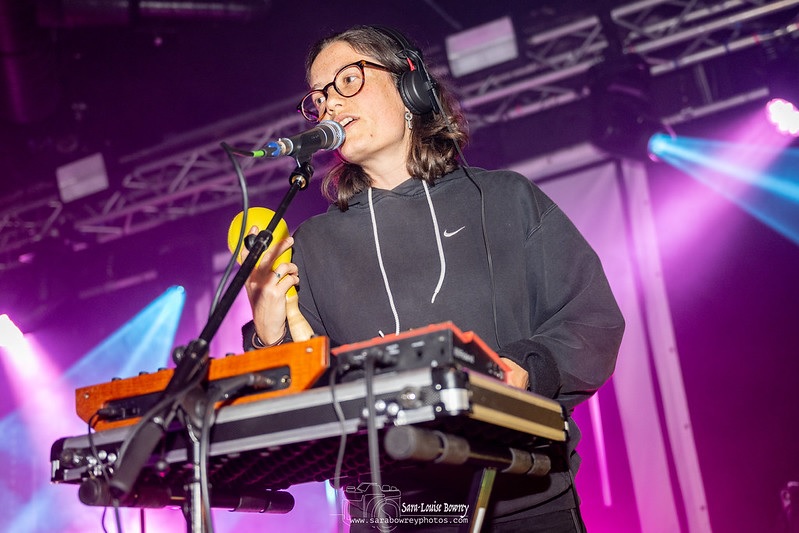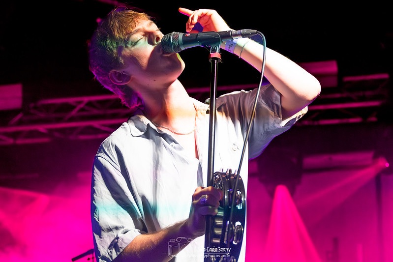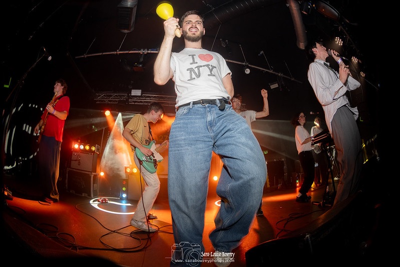 Selection two is ‘Soak Up The Culture’ which sees the usual gap year location questions being asked. All of the band members are already very animated and there’s the addition of much guitar riffage on this tune. The unreleased ‘Act You Age’ is up next with its “tragic romantic…act your age” earworm lyrics. Churchill Square gets a mention as the gang play ‘Shopping’. After which we get a handful of yet to be released material, the first of these being ‘All Dressed Up For Nothing’ which has a fantastic booming dancebeat and sees Matt trade in his guitar for a keyboard, thus adding to the electronic sounds made by Hanna on her keyboard. Cheeky chappie Welly namechecks the Pet Shop Boys’ ‘West End Girls’ at the end of the tune. After which he addresses the faithful and states “This song is for jumping!” It’s called ‘Skinny Boy’ and it’s another wonderful dance cut, nay it’s bloody epic! The song’s title is often used and is easy to pick up and sing along to. Matt holds a bubble machine at the front of the stage, and fills the first few rows of fans with something to pop, which is fun, meanwhile bassist Jacob makes his first foray into the crowd.