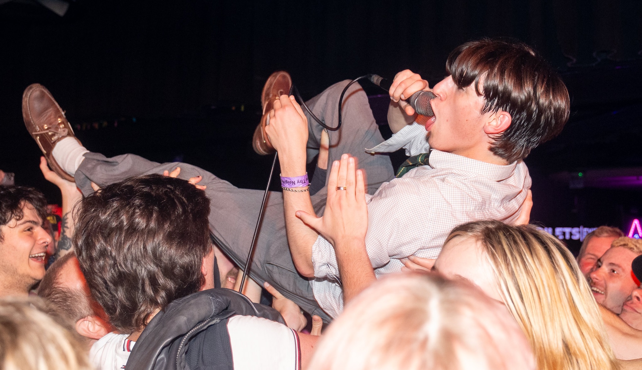 Selection two is ‘Soak Up The Culture’ which sees the usual gap year location questions being asked. All of the band members are already very animated and there’s the addition of much guitar riffage on this tune. The unreleased ‘Act You Age’ is up next with its “tragic romantic…act your age” earworm lyrics. Churchill Square gets a mention as the gang play ‘Shopping’. After which we get a handful of yet to be released material, the first of these being ‘All Dressed Up For Nothing’ which has a fantastic booming dancebeat and sees Matt trade in his guitar for a keyboard, thus adding to the electronic sounds made by Hanna on her keyboard. Cheeky chappie Welly namechecks the Pet Shop Boys’ ‘West End Girls’ at the end of the tune. After which he addresses the faithful and states “This song is for jumping!” It’s called ‘Skinny Boy’ and it’s another wonderful dance cut, nay it’s bloody epic! The song’s title is often used and is easy to pick up and sing along to. Matt holds a bubble machine at the front of the stage, and fills the first few rows of fans with something to pop, which is fun, meanwhile bassist Jacob makes his first foray into the crowd.