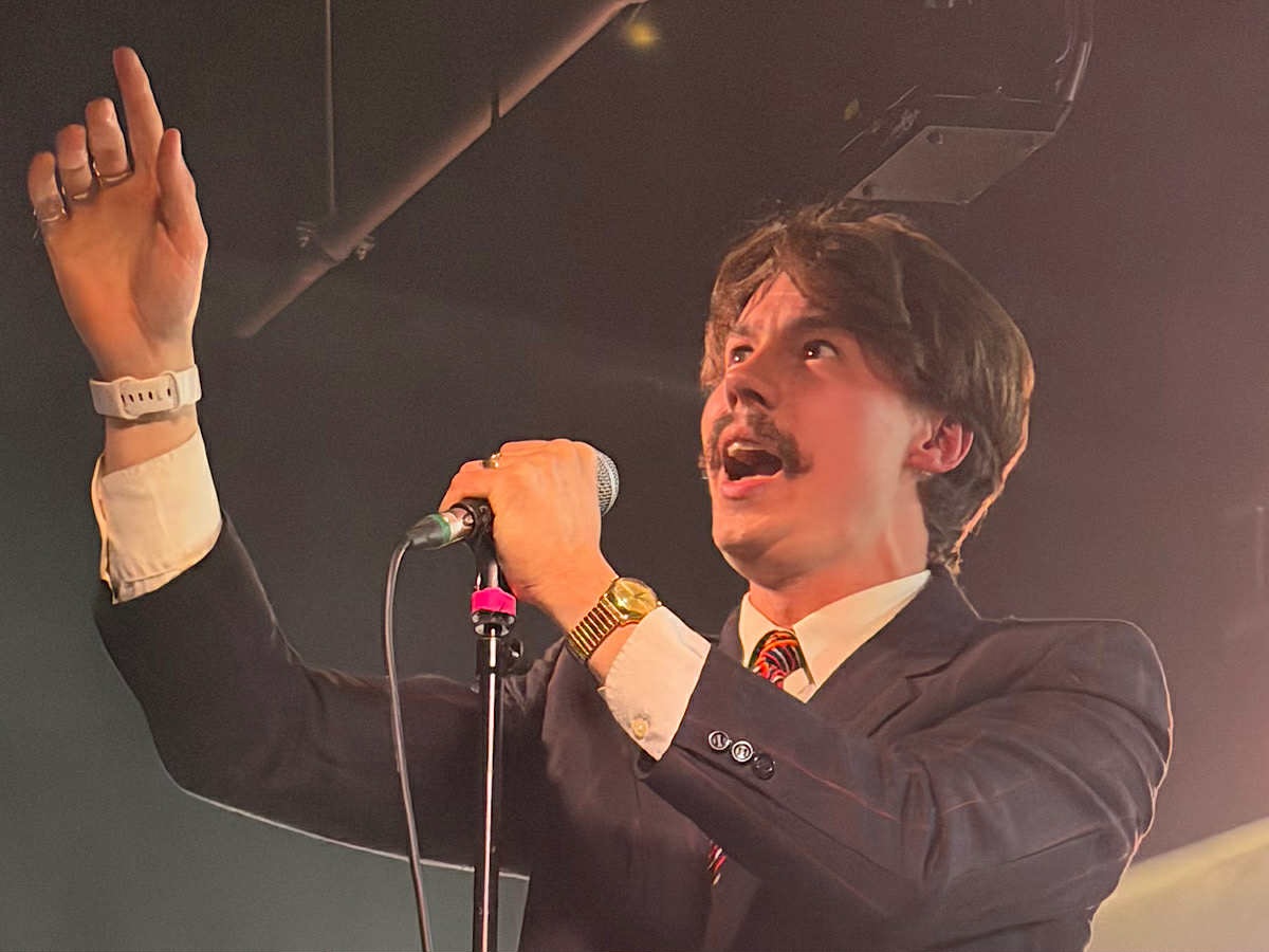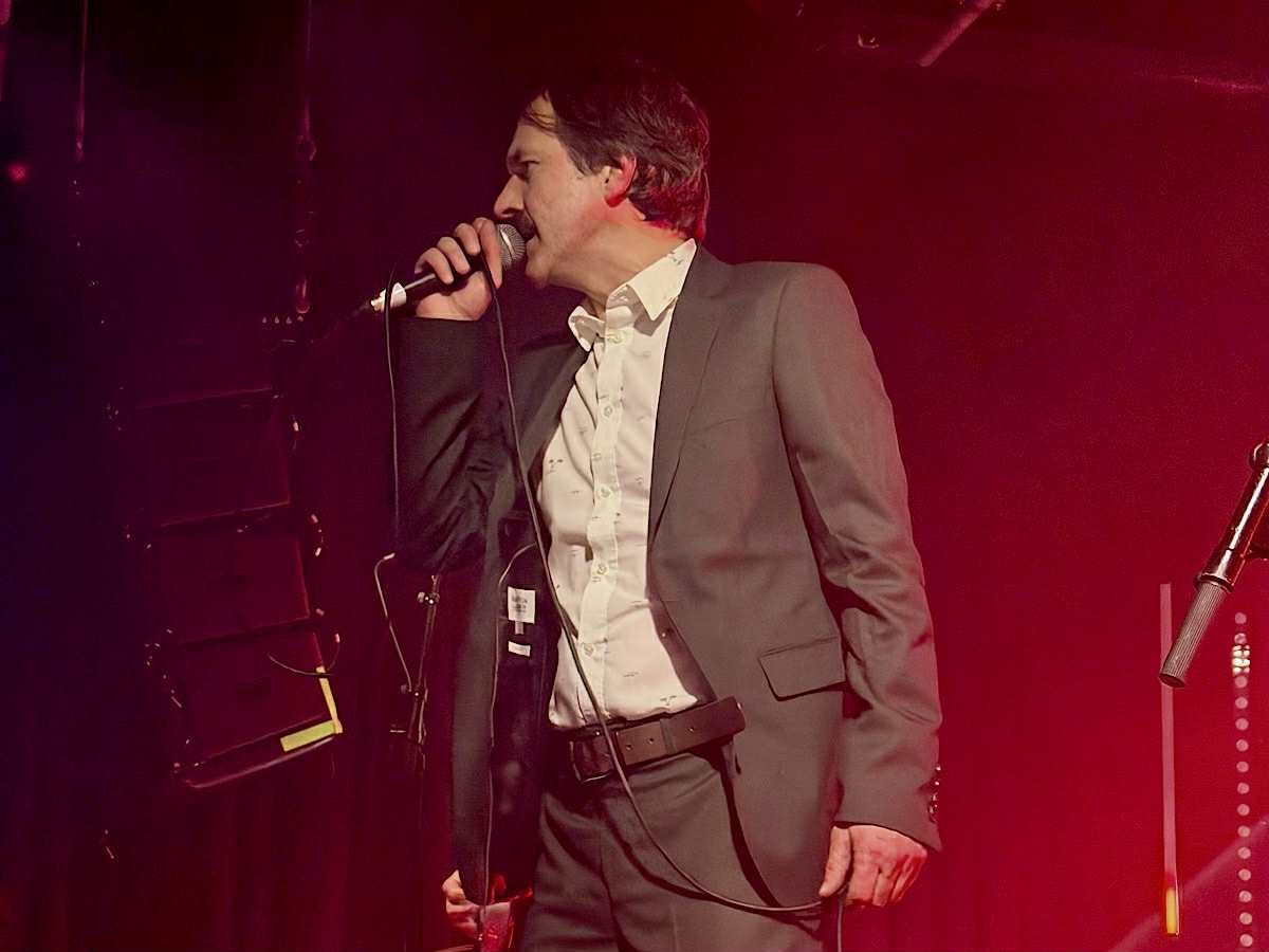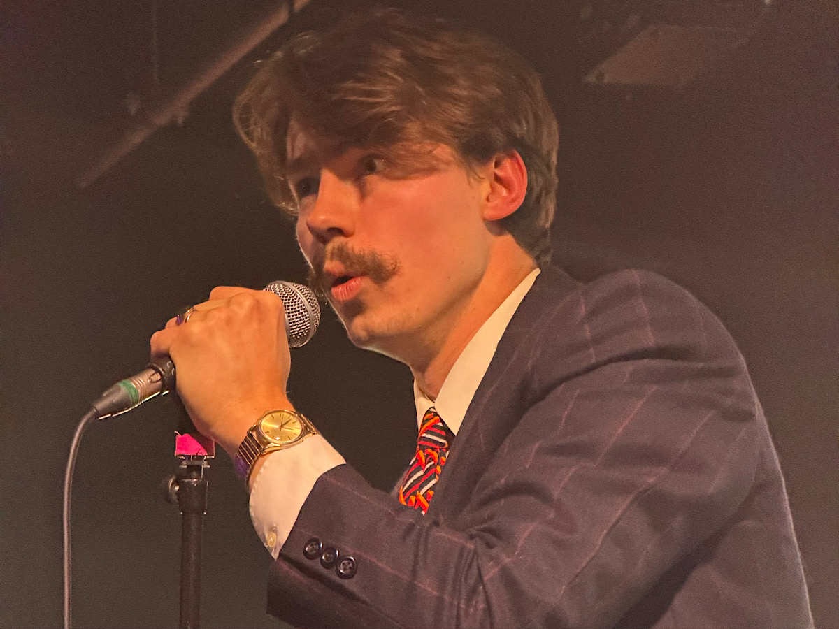 Luke Duffett, known as Enjoyable Listens, is tonight’s support act, and he’s certainly an entertaining one. During his previous appearances in Brighton at The Great Escape Festival and on a Hidden Herd bill at The Hope & Ruin, he’s been accompanied by other musicians. However, tonight he performs alone with his trusted laptop, providing all the musical accompaniment. The Oxford-born deep baritone crooner arrives on stage at 7:20pm, dressed in a stylish 80s businessman’s suit and tie. He tries to get the audience’s attention, but most are still nattering away. After three attempts at “Hello Brighton,” we’re ready to start. Unfortunately, there are technical issues that need sorting first, so Luke calls for some assistance. At 7:23pm, everything is sorted, and at the press of a button, the backing track starts up. Luke immediately walks off stage and comes back with a can of Guinness, which he consumes during the set. There are cheers, and Luke introduces the first song of the set, ‘Summer Hit.’