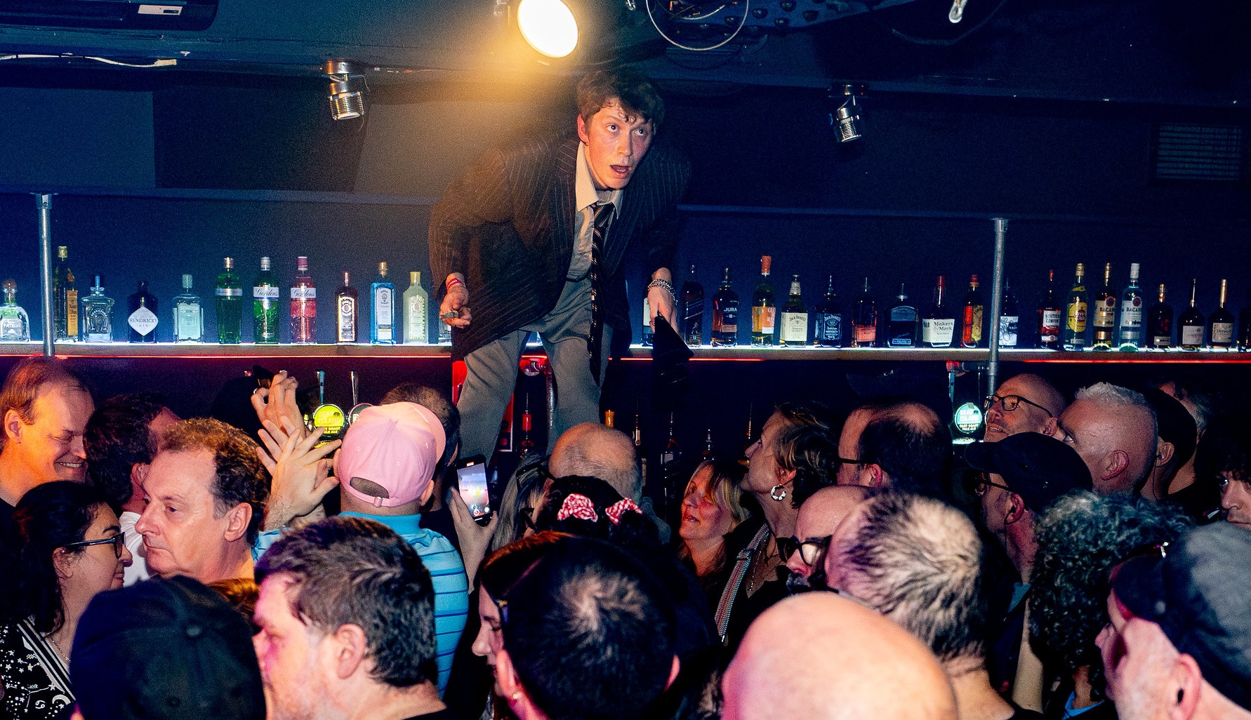 This comprised of opener ‘Lynks Thinks’ from the aforementioned record which set the tone nicely. A cover of Melbourne’s Courtney Barnett’s 2015 ‘Pedestrian At Best’ tune was up next with crab walk manoeuvres to boot. ‘Abomination’s opener ‘Use It Or Lose It’ followed with aplomb, after which we were served ‘Tennis Song’ (see what I did there!) which we are told was about “falling in love with a straight tennis instructor”. For this, Lynks Show got out their tennis racquets and served Lynks logoed soft tennis balls into the crowd. After the album’s title track, we had a new tune titled ‘Rebound’ which sounds a bit like Trans-X ‘Living On Video’ and all three of them headed off into the crowd. Lynks said as this was a music venue he had better play an instrument…cue cymbal which was struck with a drumstick when required. Their ‘Silly Boy’ earworm followed “Silly boy, you silly, little boy”.