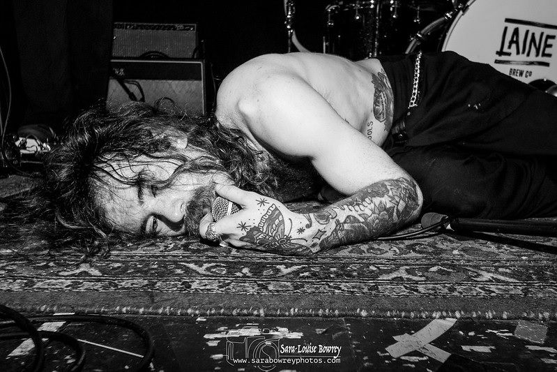 I stay in Revenge for Truck Violence. There’s half an hour before they play, but the venue is so rammed I give up on any thoughts of getting a drink. The band’s backdrop features the word ‘Violence’ and a machine gun discharging. So they’re possibly not hippies then. In contrast to the joy emanated by Coilguns, Truck Violence’s vocalist Karsyn Henderson looks distinctly troubled all the way through the set. There is a definite vibe of acute misery coming from him. The band are clearly serious musicians though: bassist Chris Clegg has a six string bass and guitarist Paul Lecours has a seven string guitar. I’m impressed!!! There’s also a banjo lurking on the stage. Quite where that’s going to fit in I don’t know, but doubtless we’ll find out. Karsyn’s vocals are distinctly reminiscent of Kurt Cobain. Maybe that explains the troubled look in his eyes. They start with a new song which is brave. Then again it’s probable that nobody here knows their material anyway. It has an inventive and unusual time signature (I can’t identify it). Ryley Klima’s drumming is incredibly powerful, and the band virtually mosh onstage as they play. The banjo comes into play on the fifth song. Karsyn sings quite tenderly accompanied solely by Paul Lecours on the banjo. Paul kneels down to play as the mic for the banjo is virtually at stage level. After that normal service is resumed with loud hardcore stuff. It’s an interesting and unusual set. I’ll make sure that I get to hear more.