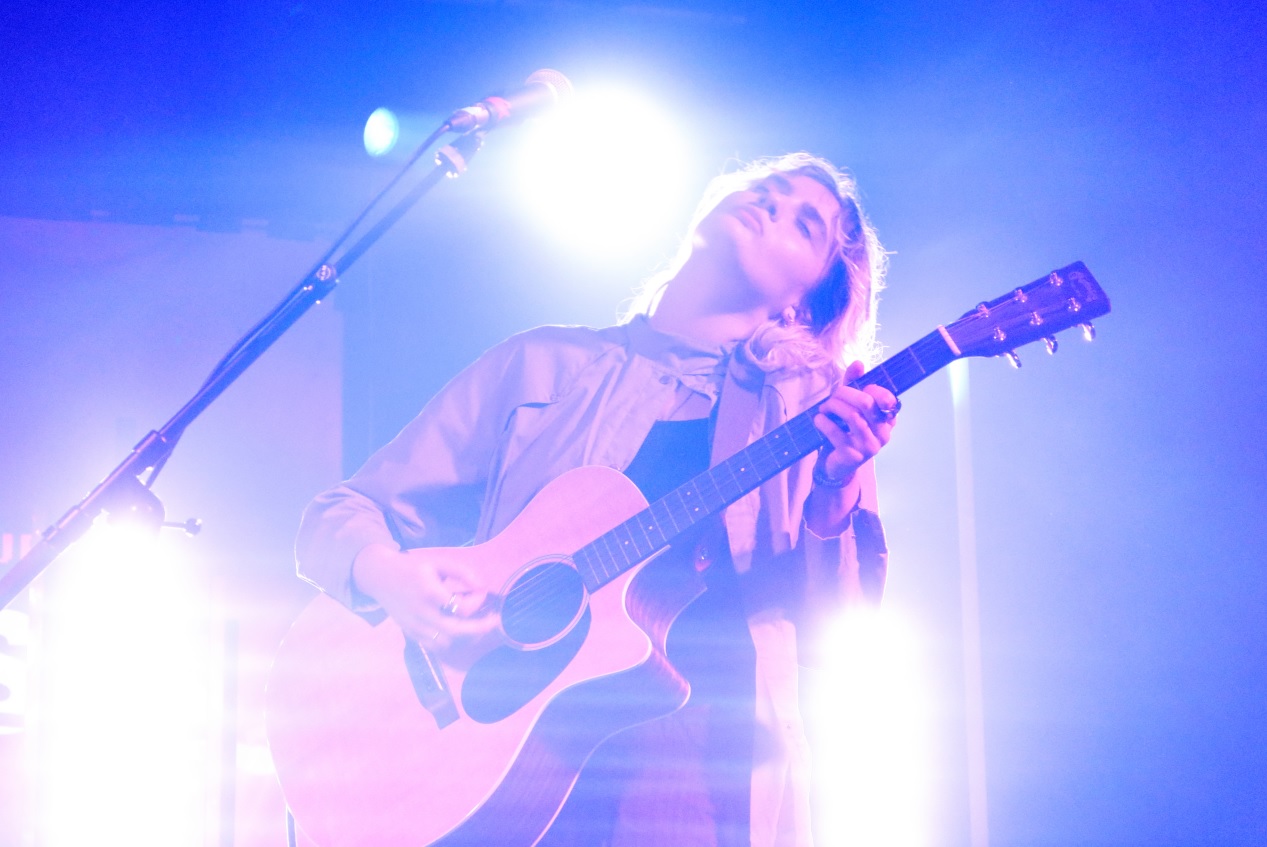 Rising local Brighton-based band Ladylike opened the second day’s entertainment at Chalk, the largest of the venues used at the festival. This was their second performance there, having supported Lime Garden in March last year. Ladylike have a unique sound made up of unconventional song structures that bring together post-rock folk music with elements of shoegaze. The vocals are beautifully sung by their acoustic guitar-playing lead vocalist, Georgia Butler. The other band members are Spencer Withey on synths, guitar, and backing vocals, James Ely on drums, and Archie Sagers on six-string bass guitar. Today’s set includes a number of newer tracks as well as a few more established songs. Their excellent second and most recent single ‘Horse’s Mouth’ is a stand-out as always. It starts with Georgia plucking away at her guitar before the other band members join in. I love the way the structure of the song is strung together with each instrumental part playing key parts throughout, with Spencer adding backing vocals and James’ crashing drums towards the end of the song. The other six songs in the set are paired up on the setlist as they seamlessly transition into each other. They opened with new ones ‘Burning Heather’ and ‘Rome’, then after ‘Horse’s Mouth’ there were a couple more newer songs. These were ‘Cheryl Cole’ and ‘Borrowed Time’, then the set concluded with ‘Fresh Linen’ and ‘Sour Carol, I’. ‘Fresh Linen’ starts and ends with James scraping a drumstick around one of his cymbals.