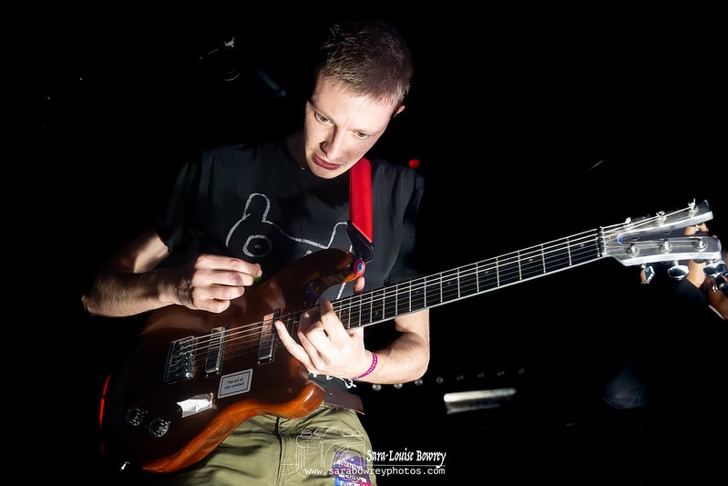 A fully packed Patterns warmly welcomed Bristol trio Waldo’s Gift for a mega 38 minute set which most definitely was quite the cacophony of sound, blending a mix of jazz, electronics, pulsing bass, wild guitar and loaaaads of drums.  Interestingly I noticed as the stage was being set up in a less conventional way, the drum kit was to the right hand side of the stage at a right angle facing towards the band rather than the audience. I also noticed no-one in the band aside the drummer had a microphone so it seemed it was to be purely instrumental, now I’d not heard or seen the band before so this is all going to be new to me. The band comprise of James ‘Jim’ Vine on drums, Alun Elliott-Williams on guitar and Harry Stoneham on the 5 string bass.