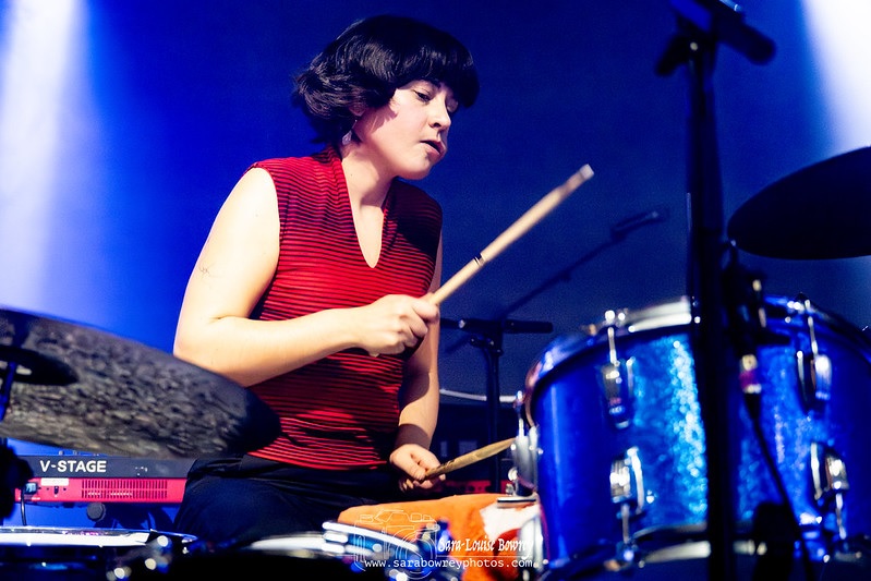 The stage was bathed in darkness, backlit to dramatic effect, as an atmospheric instrumental introduced ‘Beam/s’. Esmé’s soft vocals rose over oscillating synths before drums and guitar burst through, the pace shifting restlessly into funky grooves. Henry introduced ‘Wasp’; with a wry “about a wasp,” but the clipped guitars and strong drumming gave it a sharp dance pulse. ‘Tears Are’ followed with heavier textures, Esmé’s whispered vocals captivating in their intimacy before rising into melodic clarity. Her ability to move between hushed seduction and soaring emotion was one of the set’s defining features.
