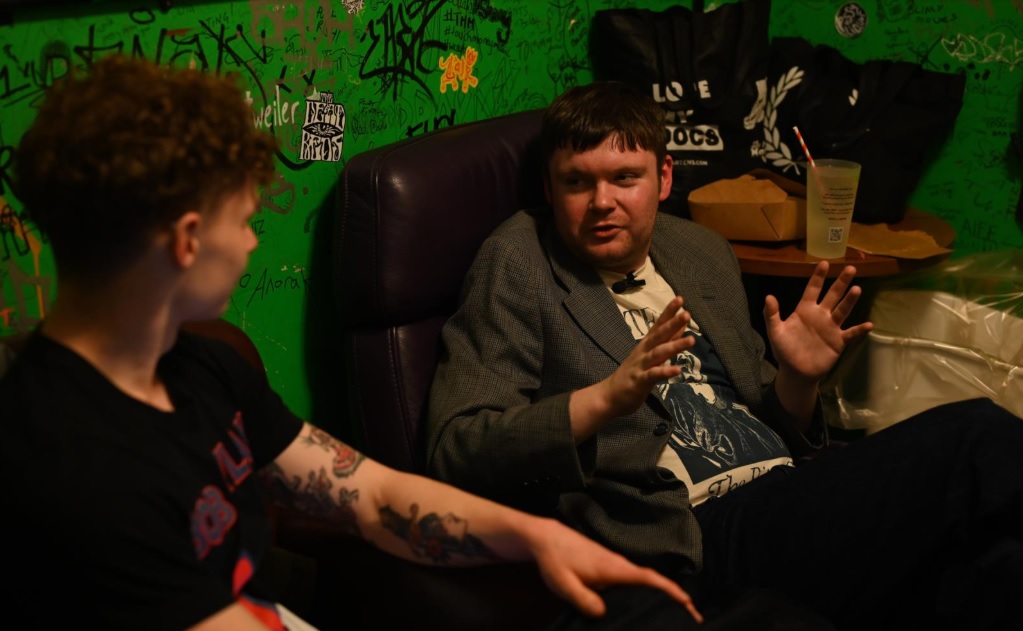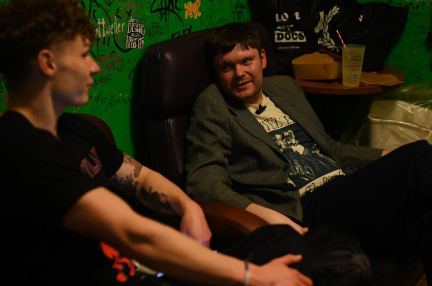 Rudi Banfield (left) chatting to Lewis Duffin of Hotel Lux at The Hope & Ruin, Brighton 28.11.25 (pic Ella Hancock)