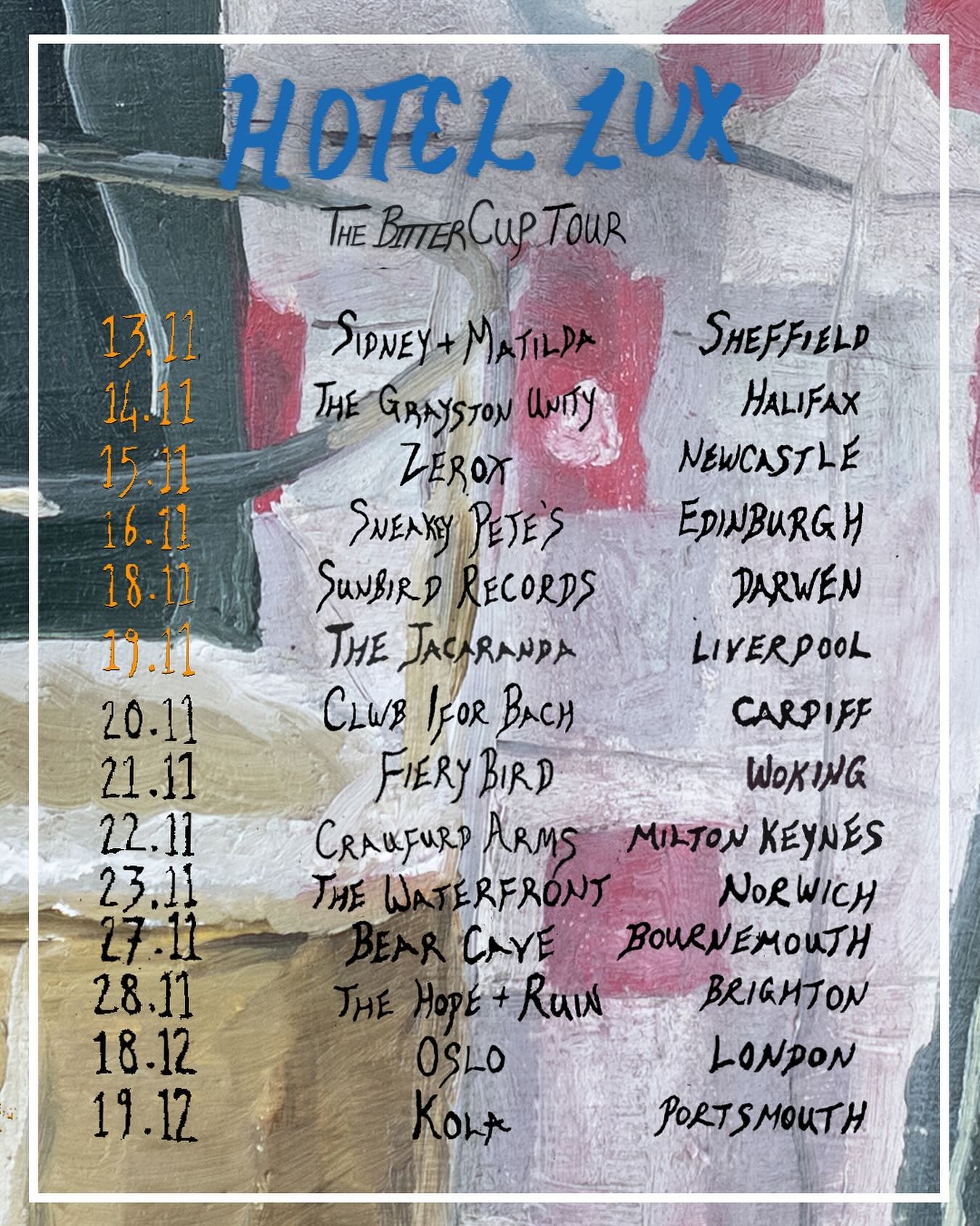 Portsmouth based Hotel Lux are a political band. But not in a shouting and stomping way. The beauty is in their casually sung yet delicately written observations. They first stumbled into my periphery following their gig at Brighton’s Green Door Store on 17th February 2023.