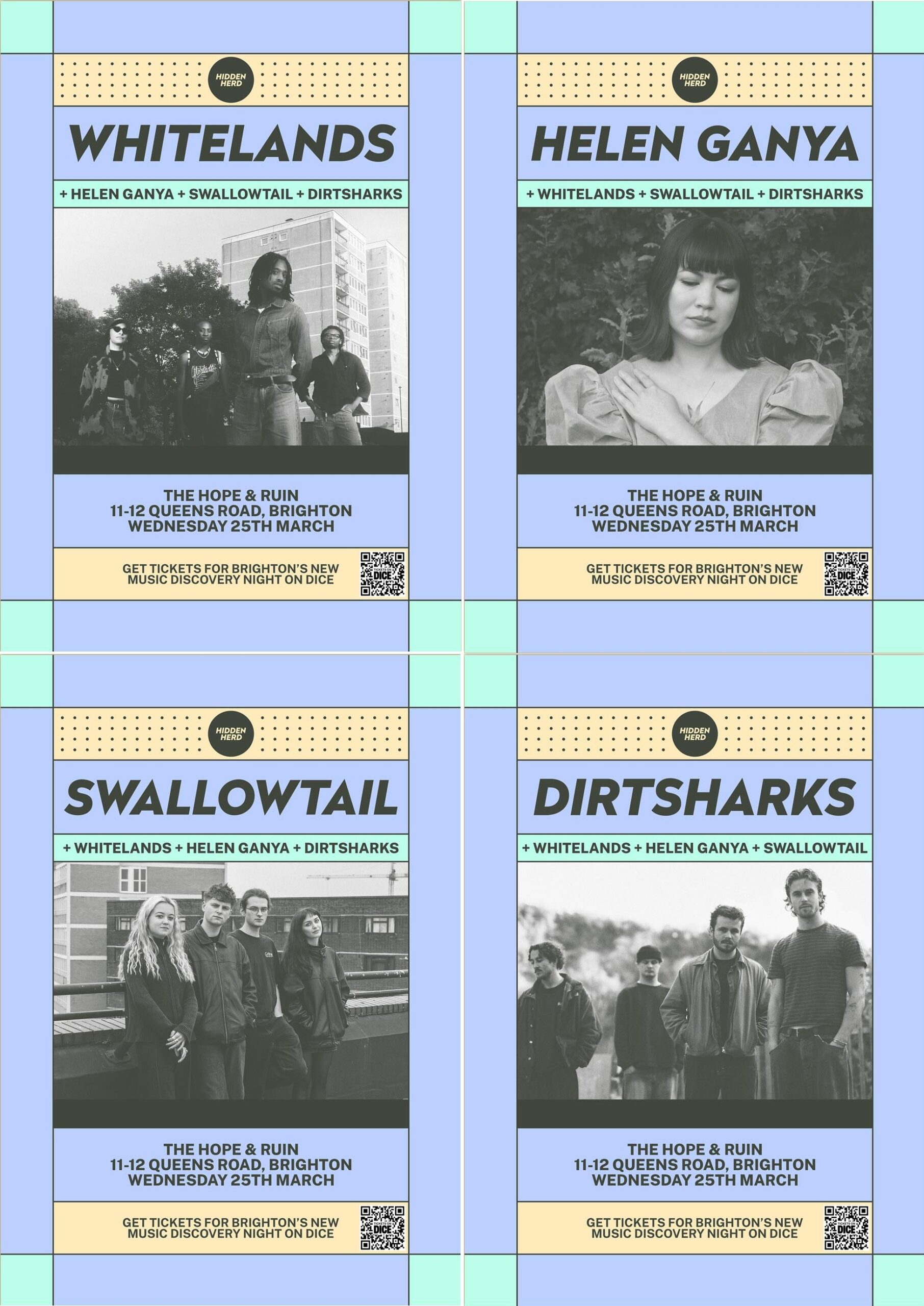 Whitelands, Helen Ganya, Swallowtail and Dirtsharks have today been named as the March installment of the ever-popular Hidden Herd new music discovery night. As always the event is spotlighting the most exciting emerging artists, ones-to-watch and hidden gems around on the scene at the moment. The venue of choice is The Hope & Ruin on Queens Road, Brighton and the date for your diary is Wednesday 25th March.