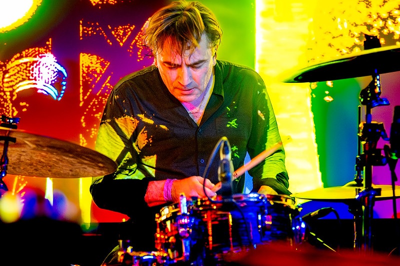 This evening they certainly take the bull by the horns so to speak and commence their set with their iconic ‘Supamotodisco’ from the ‘St Leopards’ album, which on my previous encounters usually turns up as the go-to encore track! It’s a brave move and it really sets the tone. The crowd are up for this superb electro chugger with its solid drums and top string bass guitar noted laden corker! Selection two is a newbie which will be appearing on the forthcoming LP, this being ‘Azmar’, which Oliver informs us will be dropping in a couple of months. He offers up some serious post punk guitar action on the intro to this, prior to Riz rewarding us with her hypnotic Arabian style wailing vocal delivery, along with Justin’s solid drumming. Trans-Global Underground springs to mind.