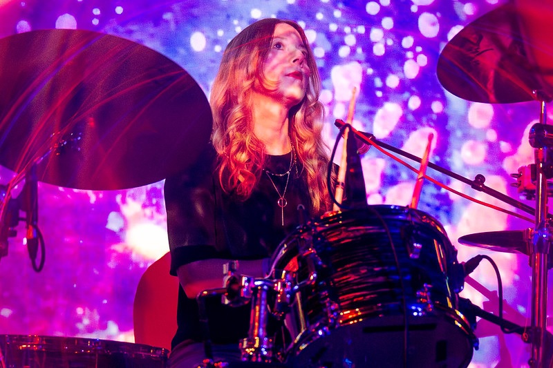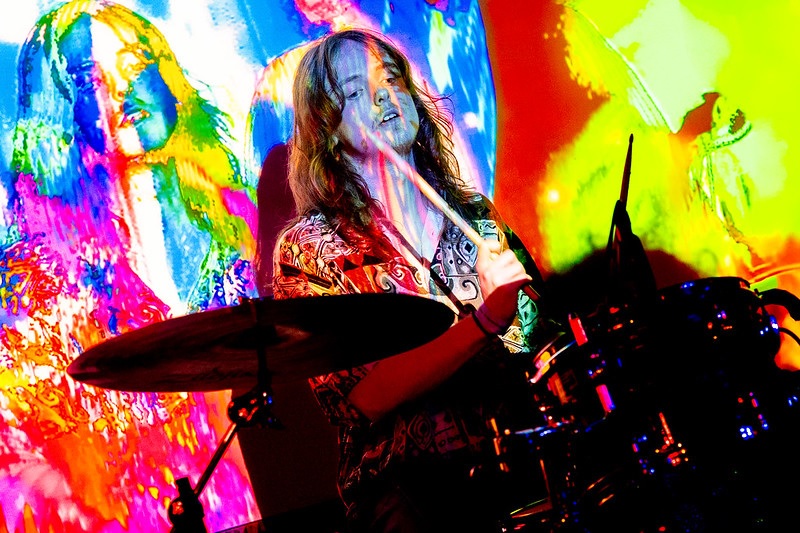 The penultimate act for this evening are another new band to me, these being Dactyl Terra who hail from Cardiff in South Wales. They are exponents of experimental heavy psych-rock, which is mixed with Krautrock instrumentation, proto-metal riffs and psychedelic melodies into a groovy fuzzy sauce. There’s five of them in the band this evening, with long hair being the order of the day. They comprise George Williams (Microbrute keys, Squier Telecaster guitar, lead vocals), Erin Julian (Fender bass, vocals), Joe Tobin (Korg synth, Squier Stratocaster guitar, tambourine) and two drummers in the form of Simon and Sam, who expertly play in unison.