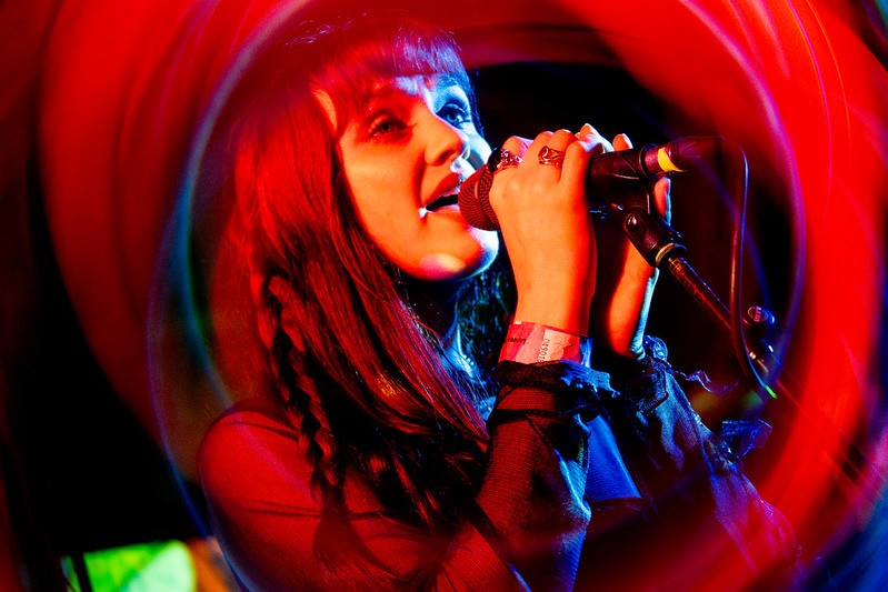 They follow with ‘New’ which simply might indicate that it’s a new composition. Caleb brings out his battered violin bow and runs it across his Fender guitar, which cleverly adds a full-on depth as if his instrument is screaming at us. This is successfully utilized throughout the all-too-short performance. After this Lucy introduces ‘Haunts’ and they get down to business. This is followed by ‘Something Holy’ which is also introduced by Lucy, who seems to be gaining in confidence behind the mic. She then goes onto introduce a tune she refers to as ‘Cowboy’, but I sense that this song’s title hasn’t quite been locked in yet and it may therefore change. For this Lucy utilizes her Gretsch guitar with tremolo arm for the only time in the set. Whereas previously Katie would have played her guitar on every track, and this is where I feel their previous intensity has been lost.