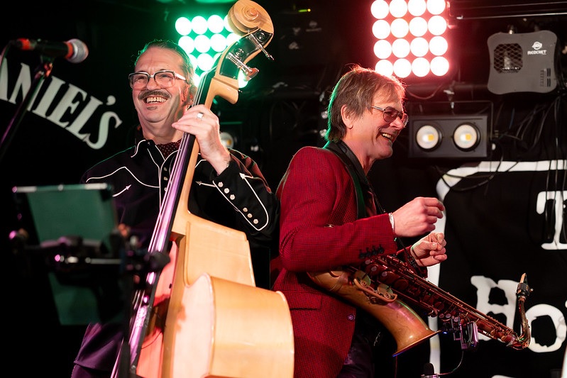 The quartet take to the stage and are all in a line, with (from our left to right) these being Jamie, Phil, Neal, and Slim Jim, who is drumming in a standing position. They set about getting the joint rockin’ by kicking off with ‘Rumble In Brighton’ from the Stray Cats 1981 ‘Stray Cats’ album, with Slim Jim on lead vocals. The band are already buzzing and Neal announces that Slim Jim is “the coolest rocker on the planet!”. They then launch into ‘Born To Rock N Roll’ which is the album title track from Neal X’s previous outfit, The Montecristos, from back in 2015. The track was penned by Whitmore & Antonia and featured Neal on lead vocals, whilst the tune itself was akin to Eddie Cochran’s ‘Summertime Blues’. It was now Polecat’s turn for the lead vocals, as they launched into ‘Rockabilly Guy’ from The Polecats 1981 ‘Polecats Are Go!’ album. Neal is back on lead vocals for the slower track four, ‘The Way I Walk’, which originally was a 1959 Jack Scott with The Chantones Vocal Group single, but many will know The Cramps version from 1978. Jamie’s saxophone certainly shines through on this live version.