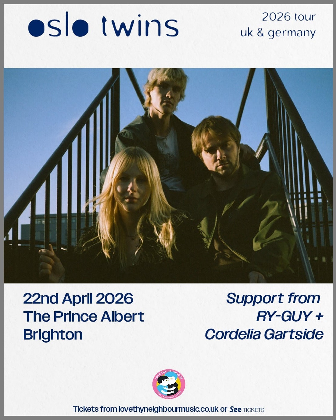 Oslo Twins are a London-based indie-synth-pop group crafting moody soundscapes that blend trip hop, lo-fi, and atmospheric electronica. Emerging from Bristol’s DIY scene, they’ve supported The Last Dinner Party and played Green Man, Manchester Psych Fest, and more. Their critically acclaimed 2025 EP ‘Tresor’, featuring their danceable hit ‘I Wake Up Slowly’, explores memory, dreams, and emotion through intimate vocals, minimal beats, and haunting textures.