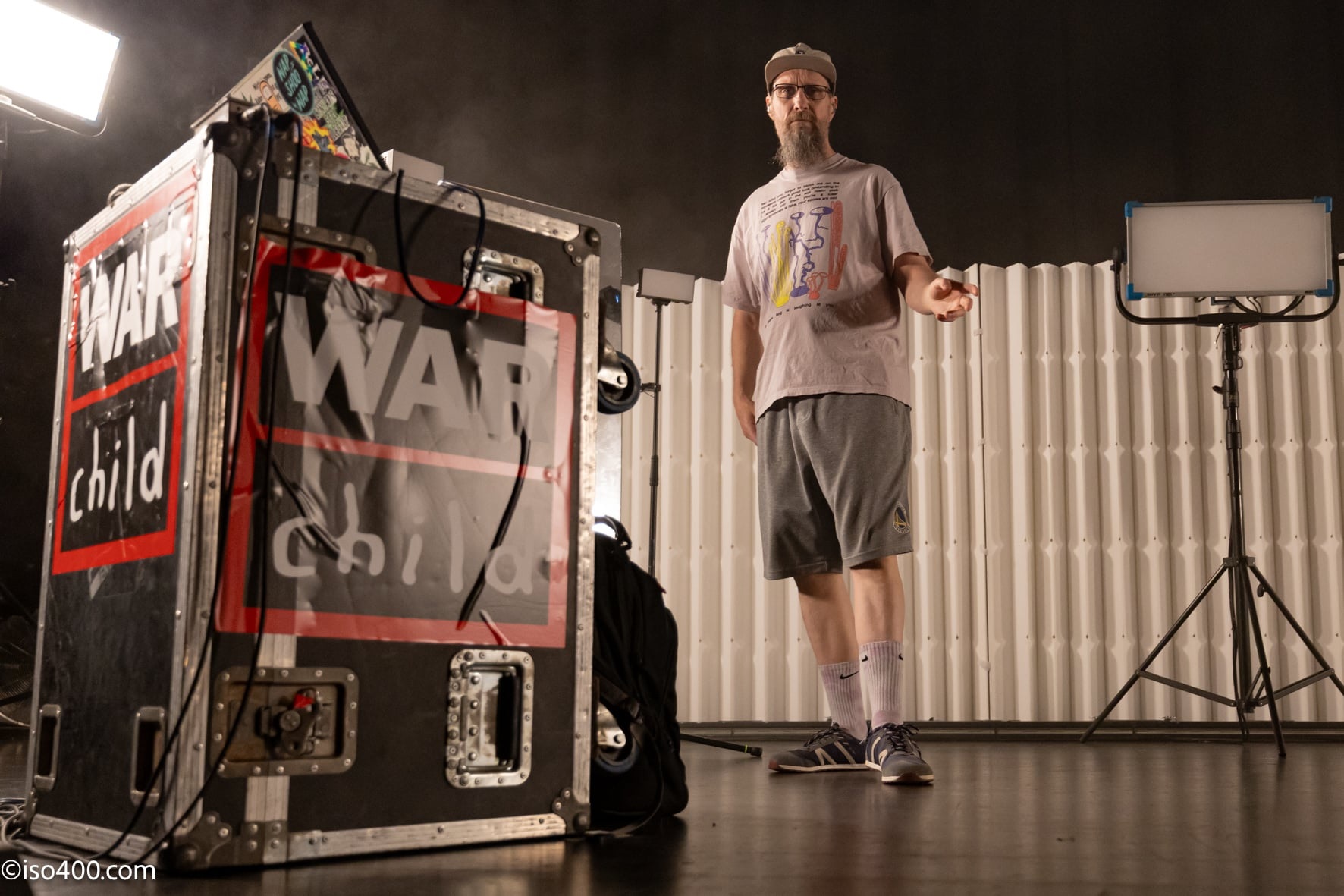 The stage set this time around reminds me of when roadmen are mending the motorways at night and also an archaeological dig. Behind the duo is a corrugated iron style sheet that is around 8 feet high and runs the width of the stage. This closes the gap between the standing crowd and the band. The crowd barrier used by the two photographers isn’t as wide either. Also on stage are two full length mirrors on either of the sides, which have the effect of there being more band members. There’s a smallish tv screen on stage in order to play videos of the backing vocals from the guests who appear on the records, and when remembered Jason announces these in appreciation to the crowd. There are four brightly flashing roadworks style lights, and ground floor thin lighting at the bottom of the corrugated wall which offer epilepsy style white flashes when required. Finally there’s Andrew’s laptop sitting atop of a box which proudly displays WAR child posters.