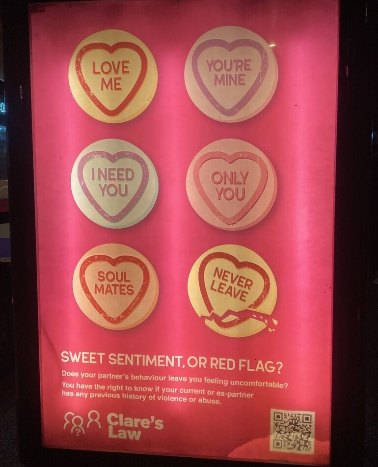 Mrs Bourne’s questions about Clare’s Law – more formally known as the “domestic violence disclosure scheme” – follow an awareness campaign last November when bus stop posters featured messages like those found on Love Hearts sweets.
