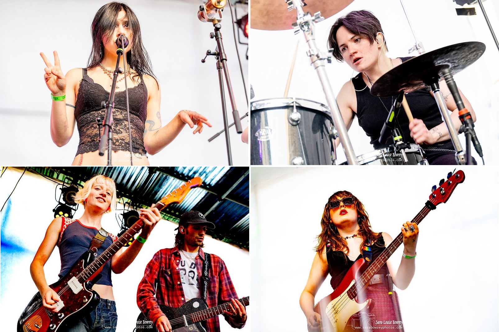 With a vintage-looking microphone installed, it’s unclear how Lonnie’s set will utilize this. Opener ‘Lucky Girl’ is all sapphic grunge but marred by deafening audio feedback; entirely a sound issue, not a band one. “Hi, we’re Lonnie Gunn! There are so many of you all of a sudden. Could you come closer, please,” Gunn requests, granting permission for a growing crowd to shuffle slightly further forward for the next track ‘Kiss You.’ Sapphic pop-grunge continues with a yearning anthem for the ages, as Lonnie herself seems like a woman possessed fronting a band with so much plaid and flannel it’s like they’ve raided 1994 Seattle.