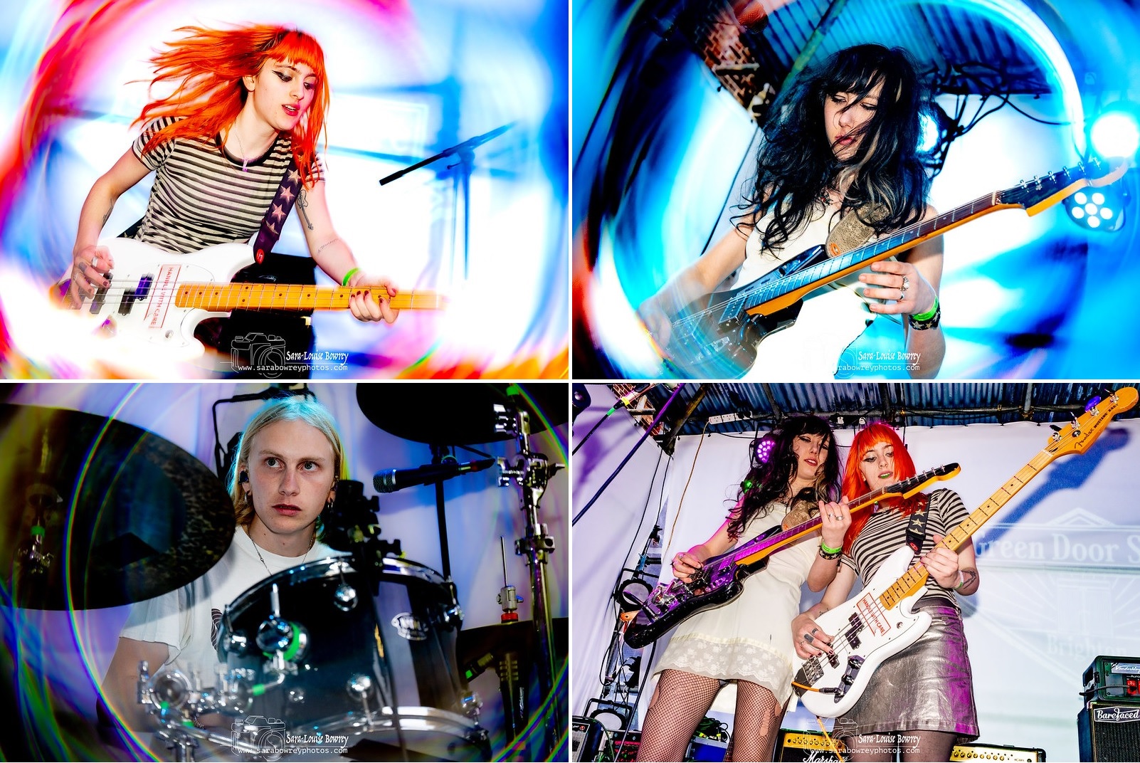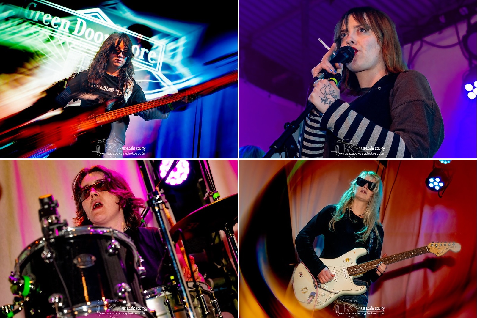 ‘Dog In A Hot Car’ is a yearning emotional outburst set to music, with a heavily modulated guitar squealing in pain alongside Gunn’s yelping of “I think my body is evil”. After applause, Gunn declares, “I love Green Door, and I’m really happy to be here” to introduce the fuzzed-out robo-grunge of ‘Love Bite,’ a track with absolutely clattering drums from Esme Wright.